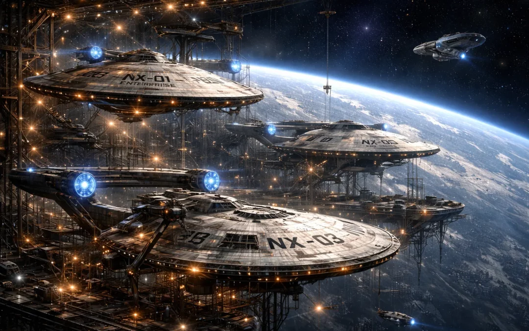 Découvrez le chantier spatial de la Fédération : les vaisseaux NX-01 Enterprise et NX-03 en construction au-dessus de la Terre sur STFE.